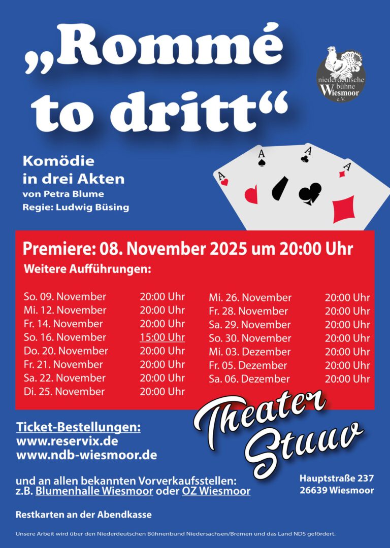 - "Theaterstuuv", Hauptstraße 237, 26639 Wiesmoor (Parkmöglichkeiten auf der gegenüberl. Straßenseite)