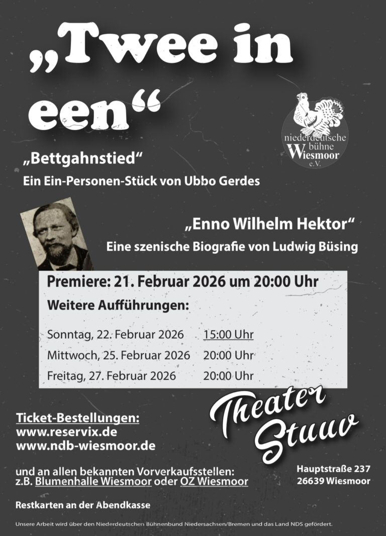 Zum einen präsentieren wir Ihnen das Ein-Personen-Stück „Bettgahnstied“ von Ubbo Gerdes. Zum anderen können Sie sich auf eine szenische Biografie über Enno Wilhelm Hektor freuen – eine Uraufführung!