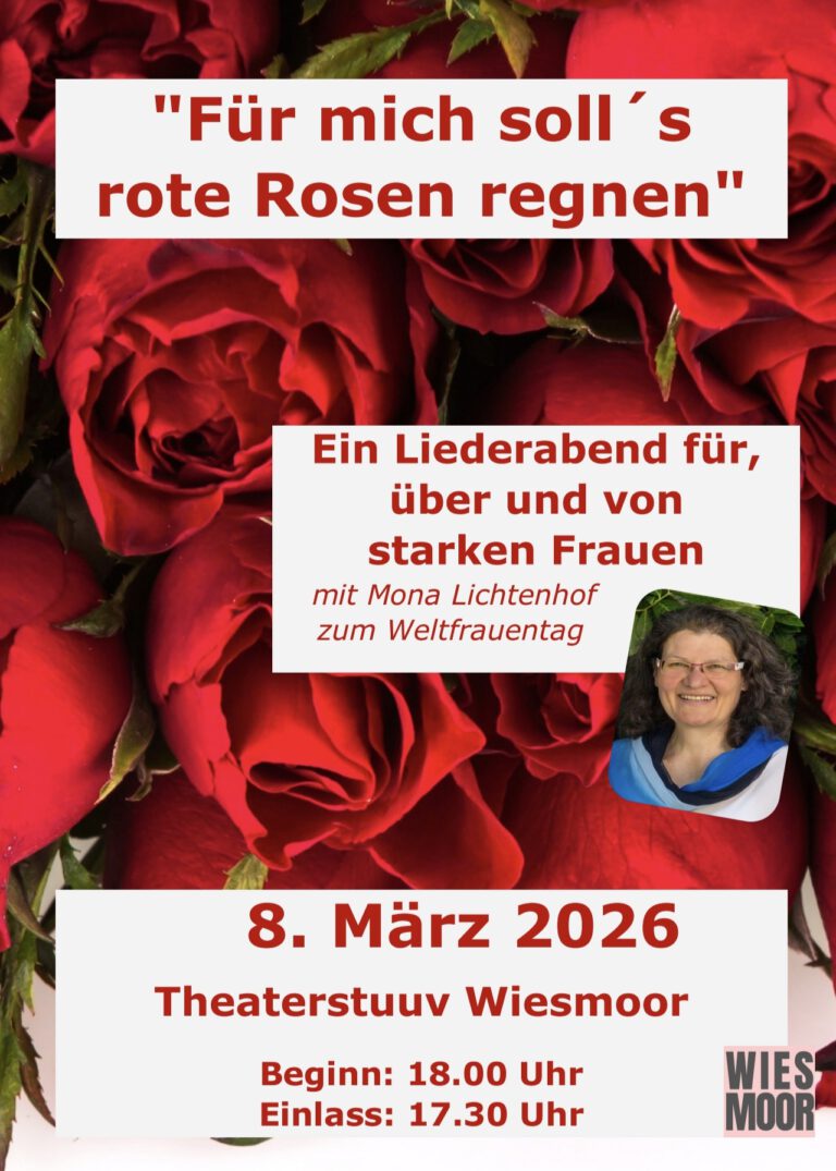 Die Gleichstellungsbeauftragte der Stadt Wiesmoor, Anja van den Boom, lädt am internationalen Weltfrauentag in die „Theaterstuuv“ ein: Freuen Sie sich auf einen Liederabend für, über und von starken Frauen. Die Künstlerin Mona Lichenhof wird mit ihrem Programm „Für mich soll’s rote Rosen regnen“ auftreten. Lassen Sie sich überraschen.
