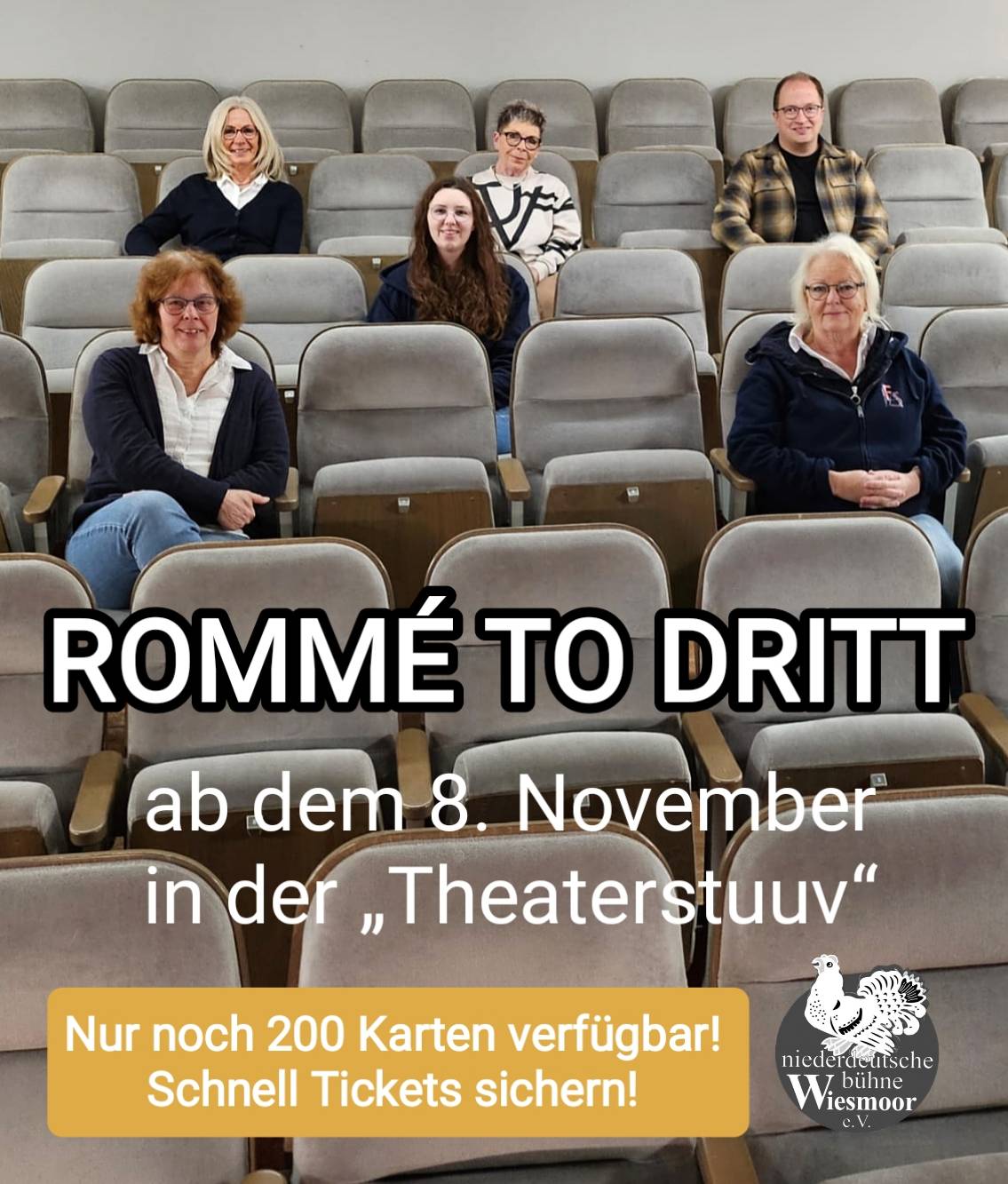 Wir freuen uns über die große Nachfrage! Für unsere neueste Inszenierung „Rommé to dritt“, die ab dem 8. November 2025 in der „Theaterstuuv“ aufgeführt wird, sind bereits viele Tickets verkauft worden.